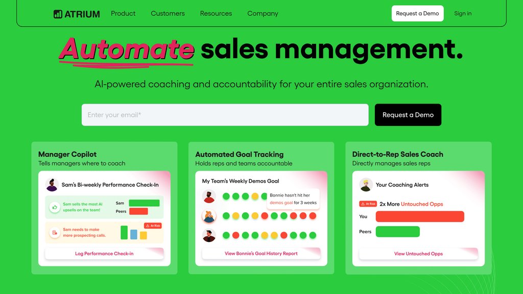O Atrium é uma solução abrangente de gestão de desempenho de vendas projetada para ajudar gerentes e equipes de vendas a gerar e acelerar constantemente o pipeline para atingir metas de receita. Ele automatiza o coaching e a responsabilidade rastreando métricas-chave de vendas, entregando insights personalizados e recomendações específicas para melhorar a higiene do pipeline, velocidade e produtividade dos representantes. A plataforma inclui um assistente de gerente virtual que alinha equipes em torno de playbooks padronizados, simplificando o coaching e permitindo tomada de decisão baseada em dados em toda a organização de vendas.