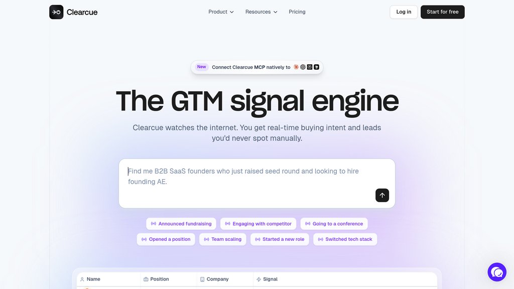 Clearcue ist eine Go-to-Market-Intelligence-Plattform, die kontinuierlich das Internet nach Kaufsignalen durchsucht — Social-Media-Aktivitäten, Stellenausschreibungen, Nachrichtenerwähnungen, Podcast-Auftritte und Konkurrenten-Engagement — und hochintentive Leads in Echtzeit an die Oberfläche bringt. Anstatt manuell zu recherchieren, ob ein Interessent am Markt ist, automatisiert Clearcue die Signalerkennung über mehrere Quellen, bewertet und qualifiziert Zielgruppen basierend auf dem, was Unternehmen tatsächlich tun, anstatt auf generische Branchentags, und integriert sich direkt in bestehende CRM- und Outreach-Tools. Es wird von über 600 Unternehmen vertraut und hat bis heute mehr als 7 Millionen Signale verfolgt.