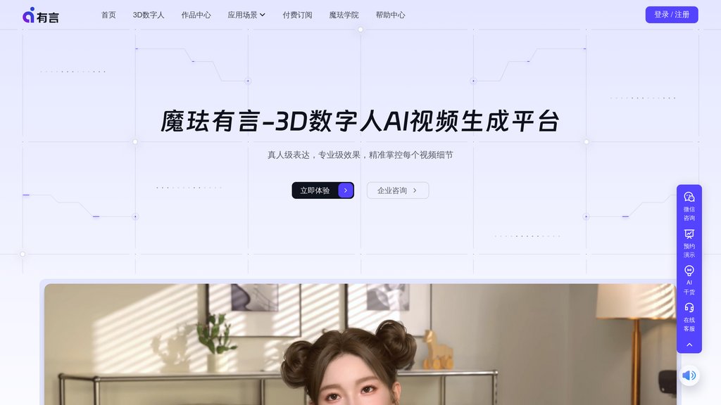 Youyan 3Dは、Xmovによって開発された包括的なテキストからビデオへのコンテンツ生成プラットフォームで、デジタルヒューマン創作の風景を変革します。このプラットフォームは、キャラクターモデリング、リギング、アニメーション、音声合成、スクリプト生成を通じて制作パイプライン全体を自動化します。ユーザーは、シーン選択、アバター選択、スクリプト入力という簡素化された3ステップのプロセスを通じて、プロフェッショナルグレードの多言語ビデオを作成できます。このプラットフォームは千以上の高品質フォトリアリスティック3Dキャラクターのライブラリへのアクセスを提供し、医療、eコマース、金融、メディア放送など様々な業界で採用されています。