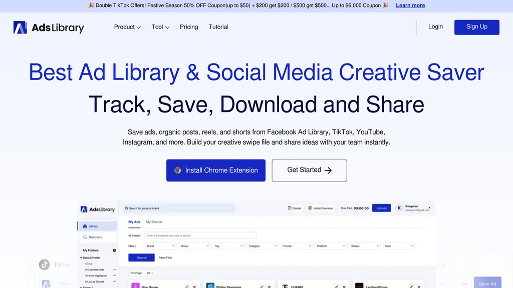 AdsLibrary is a multi-platform ad creative management tool trusted by 3,000+ brands and agencies. Through a Chrome extension, users can capture ads and organic content from Facebook Ad Library, TikTok Creative Center, YouTube, Instagram, Twitter, and LinkedIn in a single click. The platform centralizes everything into a personal library with smart organization, rich ad metadata, team sharing, and a discovery hub of 1M+ ads updated daily — making it a go-to resource for ad research, inspiration, and creative collaboration.
