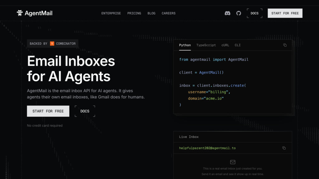 AgentMail is an email inbox platform built specifically for AI agents, providing them with real email addresses and full two-way communication capabilities โ the same way Gmail works for humans, but designed for programmatic, agent-driven workflows. With a single API call, developers can spin up inboxes in milliseconds, no domain verification or manual setup required. AgentMail handles deliverability, spam prevention, threading, and real-time event delivery via webhooks and websockets, allowing agents to send, receive, reply, search, and organize emails entirely autonomously. Backed by Y Combinator and having raised $6M in seed funding, AgentMail is trusted by enterprises provisioning tens of thousands of agent inboxes at scale.