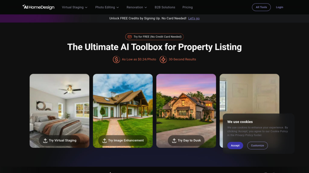 AI HomeDesign is a specialized AI platform designed to transform real estate photo editing by providing a suite of powerful tools such as virtual staging, item removal, image enhancement, and day-to-dusk conversion. Tailored for real estate agents, interior designers, architects, and home renovators, it enables fast, high-quality, and cost-effective property presentation enhancements. The platform supports seamless API integration for businesses, allowing scalable and customizable workflows that streamline listing preparation and marketing efforts.