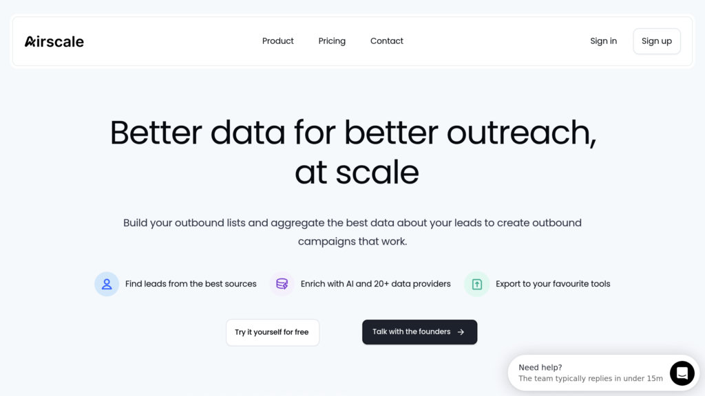 Airscale is a comprehensive lead generation solution designed to streamline outbound sales and marketing efforts. It aggregates data from over 20 trusted providers, offering real-time scraping to ensure accurate, fresh, and clean B2B lead information. The platform enables users to enrich leads with detailed company and contact data, segment and clean their lists, and export them seamlessly to CRMs or marketing tools. Airscale supports importing existing lead lists for enrichment and provides AI-driven tools to generate outbound content and verify email deliverability, helping sales and marketing teams boost campaign effectiveness.