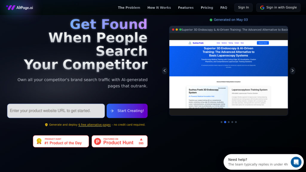 AltPage.ai enables businesses to quickly create and deploy high-performing alternative and comparison pages targeting competitor keywords. The platform automates research, content generation, SEO optimization, and publishing—no coding or design skills required. With built-in analytics, ongoing content updates, and seamless integration with major CMS platforms, AltPage.ai streamlines the process of capturing high-intent organic traffic and increasing conversions.