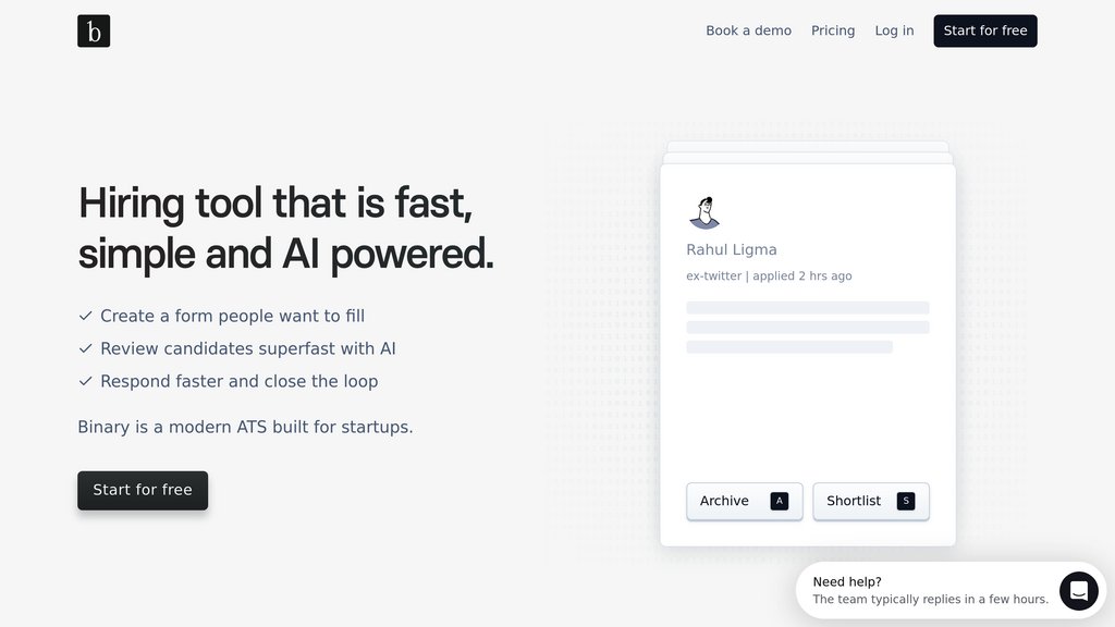 Binary is a next-generation applicant tracking system (ATS) purpose-built for modern hiring teams seeking simplicity and speed. Unlike traditional enterprise-grade ATS platforms that require lengthy implementations and sales calls, Binary prioritizes an intuitive interface with instant usability. The platform streamlines the entire hiring workflow—from creating customizable application forms with video question capabilities to automated candidate screening and streamlined review processes. Binary supports team collaboration through workspace management and granular permission controls, allowing organizations to scale their hiring operations without organizational friction. The platform's commitment to data security includes encryption at rest and in transit, with explicit assurances that candidate data is never used for AI model training.