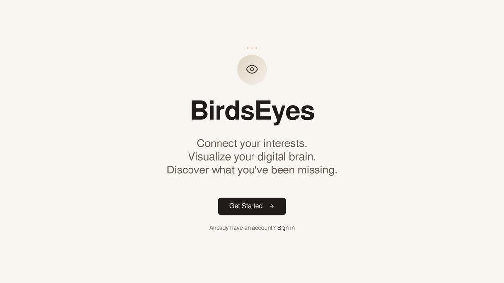 BirdsEyes is a digital platform that transforms how people discover ideas and connect with others by mapping their personal interests into a visual 'Brain.' By integrating data from books, videos, and social media accounts, BirdsEyes analyzes consumption patterns to reveal intellectual landscapes users can't see on their own. The platform breaks through information bubbles by opening windows to unexplored ideas and facilitating connections with people who share similar thinking patterns. Through compatibility matching and gamified learning experiences, BirdsEyes creates a personalized interest graph that helps users understand their information landscape and expand their horizons.