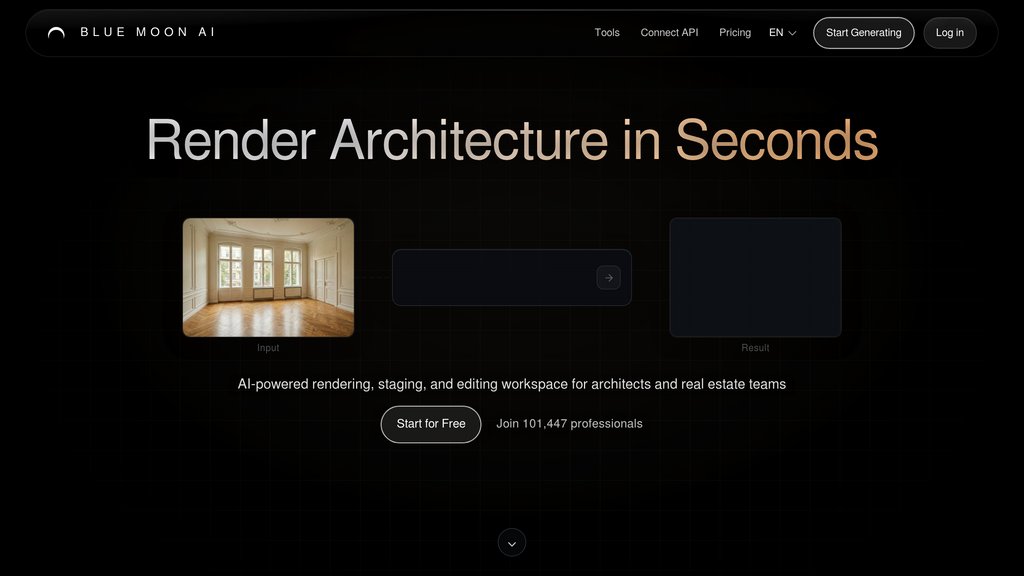 Blue Moon AI (blmn.ai) is a browser-based architectural visualization platform developed by Blue Moon Virtual, a Berlin-based studio with deep roots in real estate CGI production. The platform distills professional archviz expertise into a self-serve workflow, enabling architects, real estate developers, brokers, and freelancers to generate photorealistic renders in seconds. Core capabilities span the full visualization pipeline: from sketch or plan input to final render, image editing and inpainting, resolution upscaling, virtual staging, and animation — all without requiring 3D modeling software.