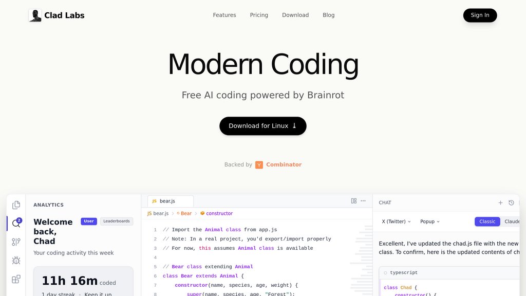 Chad IDE, developed by Y Combinator-backed Clad Labs, is a contemporary development environment designed specifically for modern coding practices. The platform seamlessly integrates entertainment activities—including gaming, social media scrolling, and interactive content—directly into the IDE interface. This innovative approach addresses a fundamental challenge in AI-assisted development: the 1-5 minute processing intervals when developers wait for AI models to complete code generation. Rather than context switching to external applications, Chad IDE keeps developers engaged within the workspace. The environment supports multiple AI coding providers and includes sophisticated agent capabilities for running parallel coding tasks, comprehensive analytics to track productivity metrics, and an integrated leaderboard system to foster community engagement. Currently available in closed beta, Chad IDE targets developers who seek a more dynamic and integrated approach to their daily coding workflows.