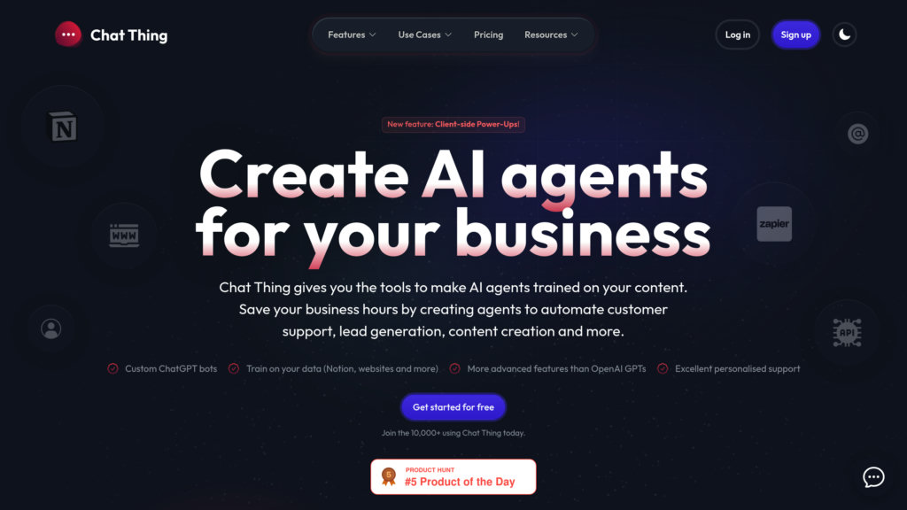 Chat Thing enables users to build custom AI chatbots powered by ChatGPT that leverage their own data from sources like Notion, websites, YouTube, and files. These bots can be embedded on websites or integrated with platforms such as Slack, WhatsApp, and Discord. Chat Thing offers advanced features including multi-channel support, sentiment analysis, bot usage analytics, and the ability to automate real-world tasks via Power-ups. Its SDK allows developers to create tailored AI assistants that understand page context and perform custom actions, significantly reducing development time. The platform supports automatic data syncing to keep bots updated and provides flexible subscription plans with generous token allowances.