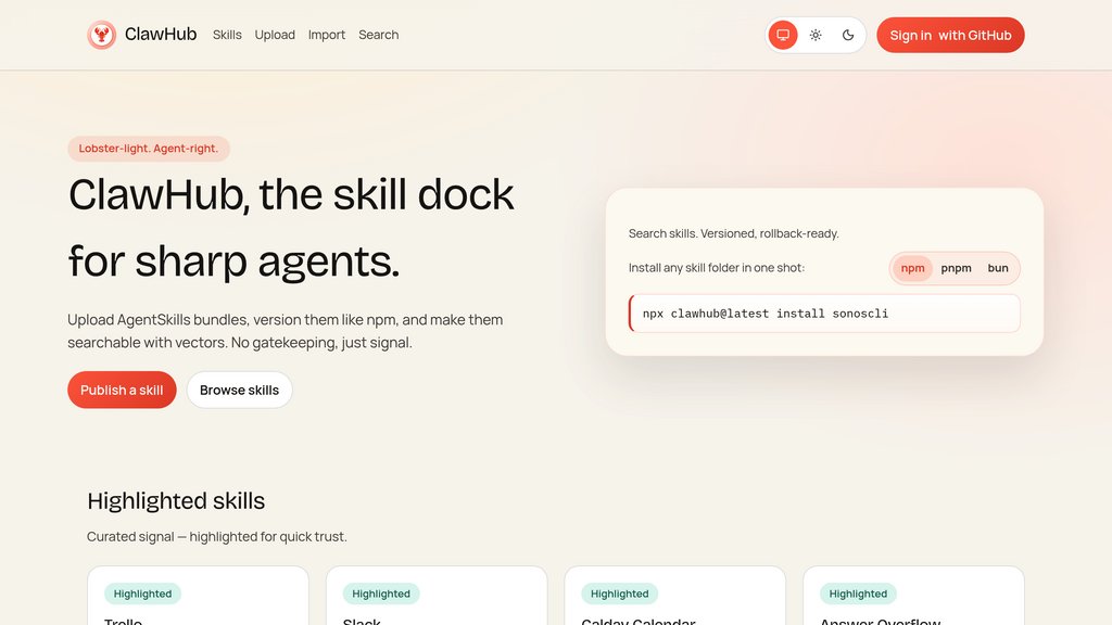 ClawHub is the official public registry for OpenClaw agent skills, providing a central place to publish, browse, and reuse skill bundles built on the AgentSkills standard. Each skill is a lightweight package (typically a folder with a SKILL.md file and supporting resources) that teaches an agent how to perform a specific task, such as integrating with third-party services or automating workflows. The platform exposes a web interface for discovery plus a CLI for installing, updating, and managing skills directly from developer environments. ClawHub is free to use and open source, making it easy for individuals and teams to extend OpenClaw agents with community-maintained capabilities.