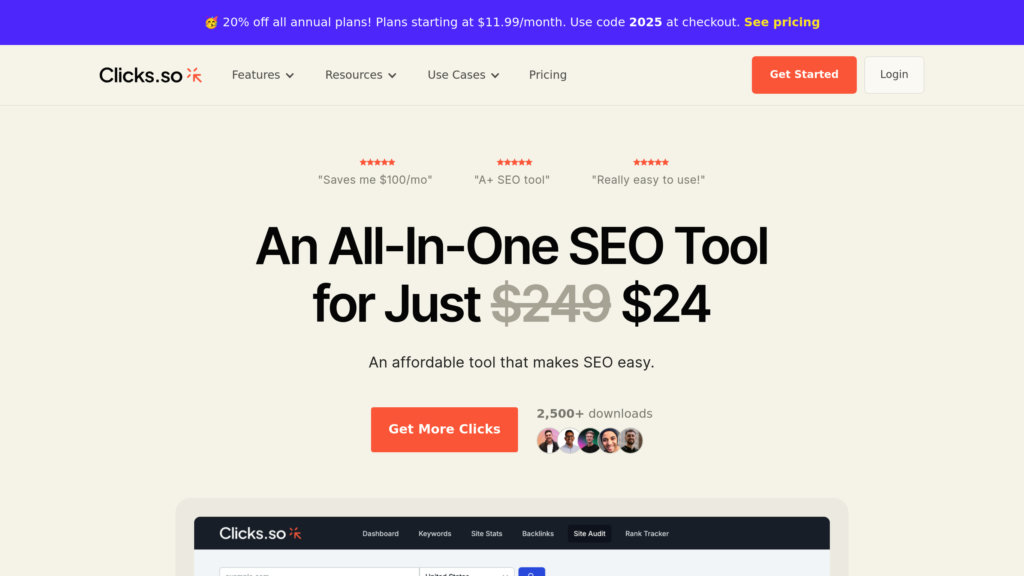 Offers a full suite of SEO tools for a flat monthly fee of $24.99, making professional SEO accessible to small businesses and freelancers.
