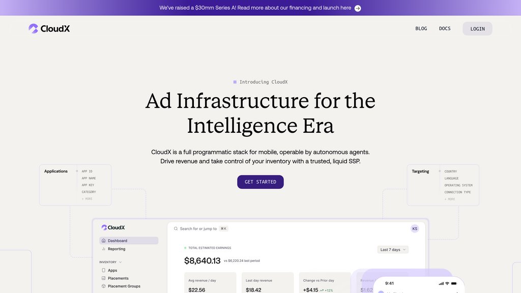 CloudX is a next-generation supply-side platform designed for mobile and AI publishers in the intelligence era. Founded by the creators of MoPub and MAX, the platform reimagines ad monetization through agentic automation and a 'Monetization as Code' approach. CloudX features a Trusted Execution Environment ensuring verifiable transparency for every auction and transaction, while enabling publishers to optimize revenue through a liquid marketplace. The platform reduces SDK integration time by approximately 90% through its layered AI agent system, delivering production-ready code within minutes. Publishers gain direct control over inventory with holistic visibility into bids, auction results, and performance metrics.
