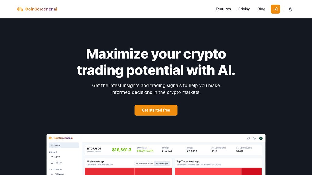 CoinScreener delivers an all-in-one crypto analytics platform designed to help traders optimize their strategies by providing timely trading signals, monitoring whale activities, and tracking top trader moves across over 1000 markets. Utilizing a proprietary algorithm enhanced with machine learning, it scans major crypto exchanges to deliver accurate insights and alerts that empower users to act swiftly and confidently in volatile markets.