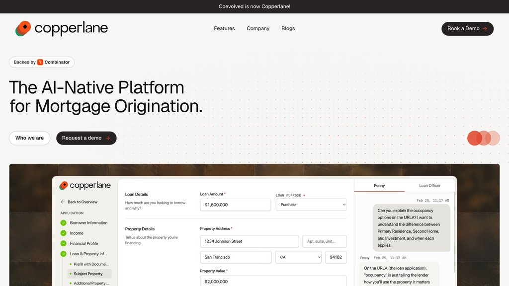 Copperlane is a mortgage origination platform backed by Y Combinator that replaces the manual back-and-forth between loan officers and borrowers. Its AI assistant, Penny, handles document requests, asks clarifying questions, pre-verifies submissions, and flags issues before files reach underwriting. Loan officers get a unified pipeline dashboard showing every borrower, document, and flag in one place — eliminating the need to chase emails and chase paperwork across disconnected tools.