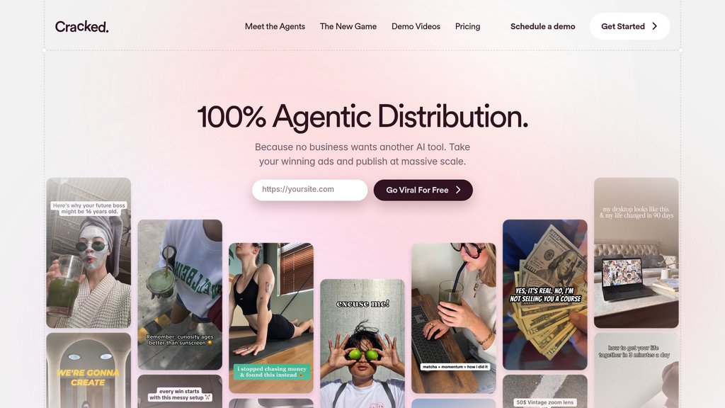 Cracked is an 'agentic distribution' platform designed to automate the labor-intensive process of social media marketing. Unlike standard tools that focus solely on content generation, Cracked handles the entire distribution lifecycle. Users upload their high-performing ad creatives (or 'winning ads'), and the system's engine remixes them into hundreds of unique variations. These assets are then published autonomously across a proprietary network of over 10,000 'AI Influencers'—accounts operating on advanced phone hardware to simulate organic engagement. By treating organic reach as a programmable commodity, Cracked offers a 'Paid Organic' alternative to traditional advertising, claiming significantly lower CPMs and reduced manual oversight.