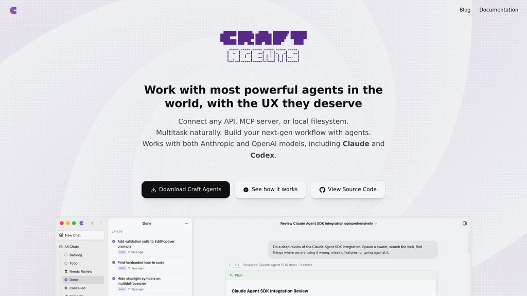 Craft Agents is an open-source desktop application built on Claude's capabilities that provides a unified interface for AI agent interactions. Unlike traditional code-centric tools, it offers a document-style workflow where users can manage multiple concurrent tasks, connect to various sources (GitHub, Slack, Calendar, local files), and control agent autonomy through flexible permission modes. Everything runs locally with encrypted credential storage, and the platform supports the Model Context Protocol (MCP) for seamless integrations. The interface treats conversations as persistent sessions that can be organized, flagged, and assigned workflow statuses.