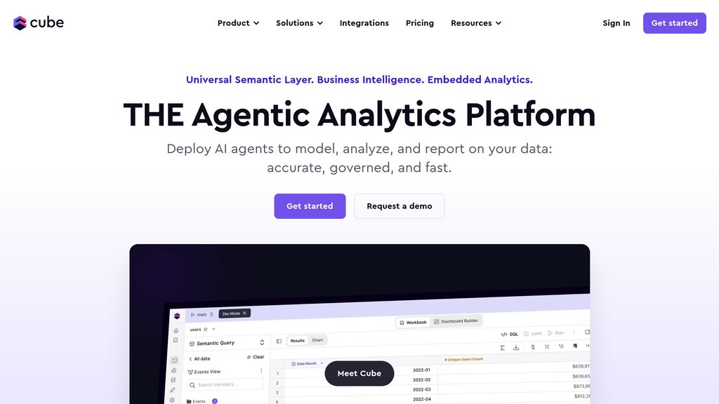 Cube is an agentic analytics platform built on a universal semantic layer that centralizes business logic and data definitions across an organization's entire data ecosystem. It allows teams to model their data once in a declarative format and deliver it consistently to any analytics tool, dashboard, or application through various APIs. The platform emphasizes four core pillars: data modeling, access control, caching and pre-aggregation, and API integration. By consolidating metric definitions into a single source of truth, Cube eliminates the need to write duplicate queries across different tools and ensures consistent data interpretation organization-wide. The platform integrates seamlessly with cloud data warehouses, supports real-time and batch data processing, and includes an AI API for natural language queries with LLMs.