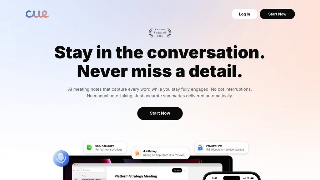 Cue is a hands-free meeting note-taking solution designed to help professionals stay fully present during conversations while ensuring no detail is missed. Unlike traditional meeting assistants that require bot invitations or display recording warnings, Cue operates silently in the background on your device, capturing both in-person meetings and virtual calls with 95%+ transcription accuracy. The platform automatically generates searchable transcripts, concise summaries, and action items within seconds of your meeting ending, making it ideal for client calls, research interviews, team meetings, and any professional conversation where full attention matters.