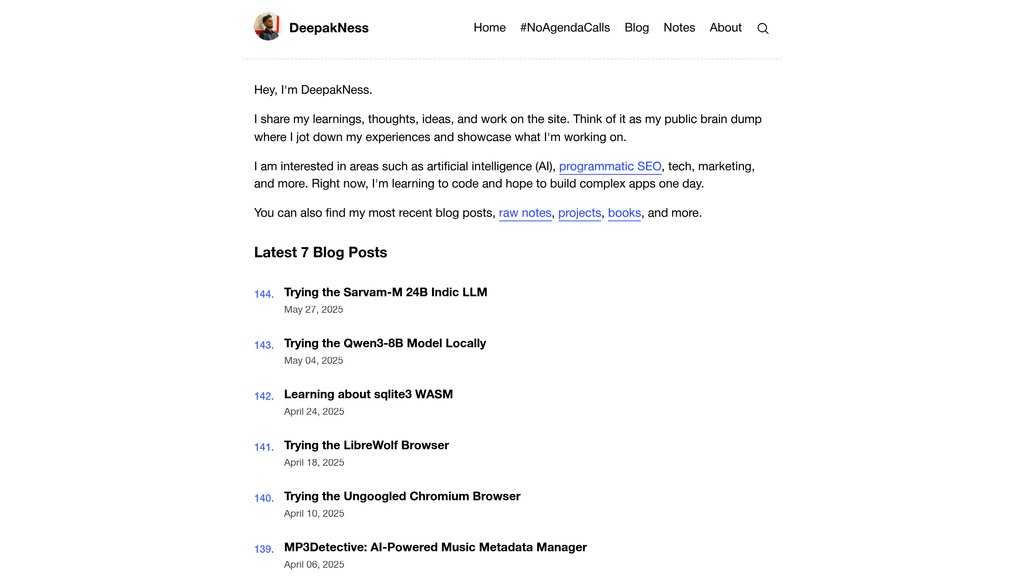 DeepakNess is the online presence of an internet entrepreneur focused on programmatic SEO, generative engine optimization, AI, and software development. The site serves as a public repository for thoughts, experiences, and ongoing projects, including blogging, coding experiments, and tool reviews. It highlights a commitment to learning and building complex applications, while also sharing resources and tools relevant to digital marketing and AI-driven content strategies.