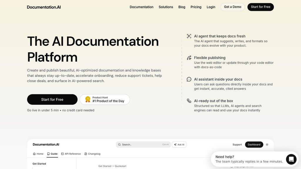 Documentation.AI is a documentation and knowledge base platform designed for product and engineering teams that need their docs to evolve with the product, not lag behind it. It combines a web editor and docs-as-code workflow with an embedded documentation agent that suggests, drafts, and restructures content so updates are quick and consistent. The system is built to be immediately usable by people, search engines, and language models through structured content, llms.txt, and an MCP server. With high-performance hosting, strong customization, analytics, and in-doc assistants, Documentation.AI turns documentation into both a support deflection layer and a conversion asset.