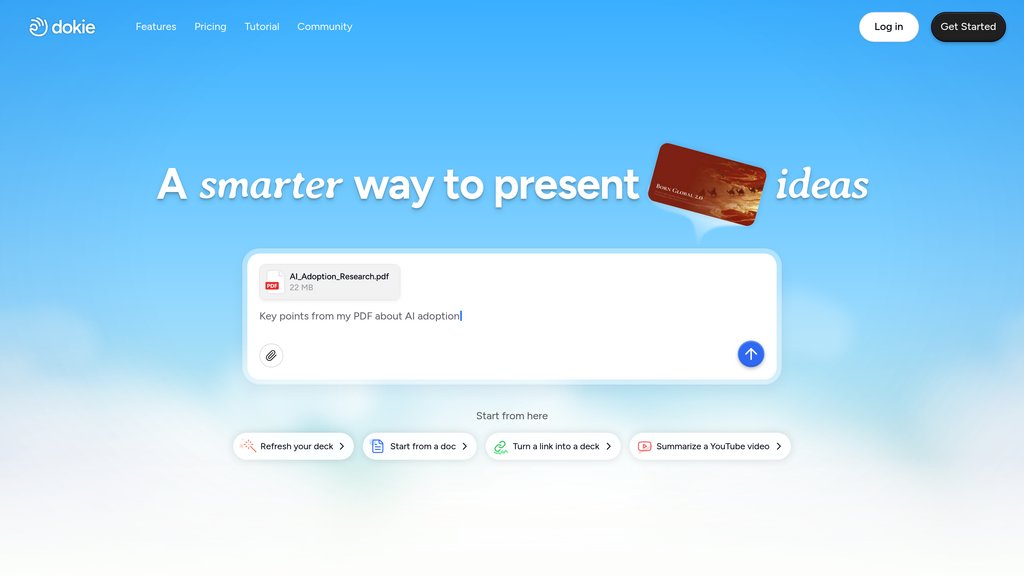 Dokie is an intelligent presentation platform designed to streamline slide creation through conversational AI and smart content generation. Users input topics, documents, or existing presentations, and Dokie intelligently generates structured, well-designed slides with accurate content and professional layouts. The platform combines content intelligence with design capabilities, allowing users to refine presentations through interactive dialogs with the AI. Unlike traditional presentation tools, Dokie understands context, asks clarifying questions to ensure directional accuracy, and maintains design consistency while keeping layouts clean and uncluttered. The platform supports custom template uploads, enabling users to maintain brand consistency across presentations. All content and design elements remain fully editable in real-time, with the AI adapting layouts and visuals automatically as changes are made.
