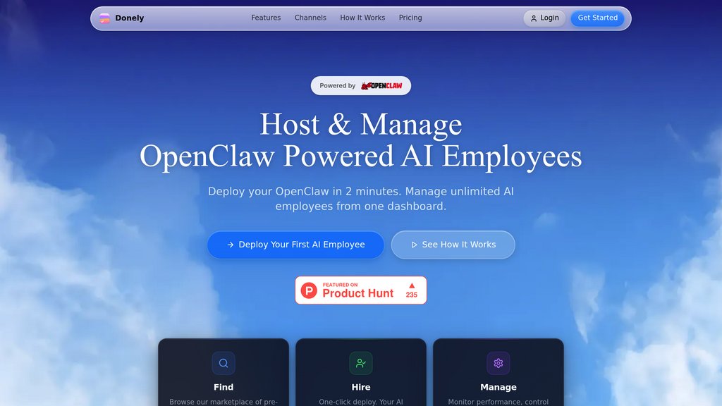 Donely is a cloud-hosted management platform built around OpenClaw, an autonomous AI agent framework. It removes the technical overhead of deploying AI workers by letting individuals, agencies, and enterprises spin up isolated agent instances in under two minutes — no SSH, no Docker, no config files. Each instance runs in a secure, airgapped container and can connect to over 850 business tools out of the box. From a single dashboard, users manage access controls, monitor performance, view audit logs, and handle unified billing across all instances, whether they're running one personal agent or dozens of client deployments.
