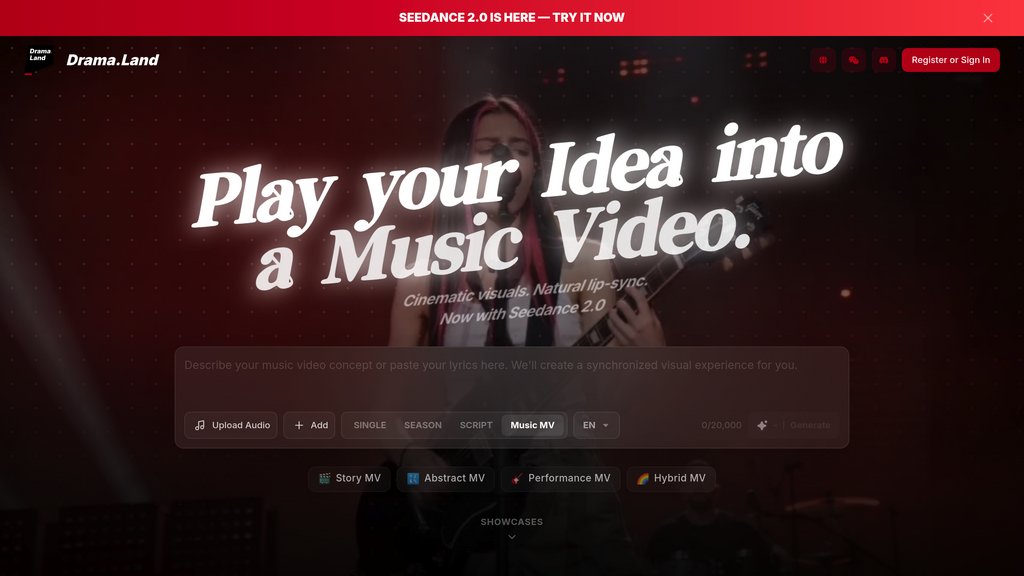Drama.Land is an all-in-one creative studio built around a single outcome: finished music videos. Unlike traditional tools that treat songwriting and visual production as separate projects, Drama.Land generates music, visuals, rhythm alignment, and lip-sync together in a single process. The platform is designed for musicians, independent creators, and storytellers who want to move from idea to shareable content without switching between tools, managing timelines, or handling technical post-production. With over 100 integrated visual styles and a narrative-first approach, characters stay consistent and story worlds persist across generations — making it possible to build not just single videos, but serialized visual narratives from one original idea.