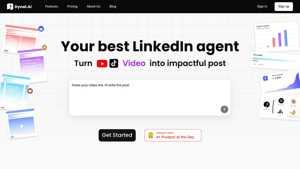 Dynal is a specialized content creation platform designed specifically for LinkedIn professionals and content creators. It streamlines the entire LinkedIn content workflow by helping users generate post ideas, convert various content formats into LinkedIn-ready posts, and optimize their content for maximum engagement. The platform leverages intelligent content transformation to turn raw materials—whether text, PDFs, videos, or social media content—into polished, professional LinkedIn posts. With built-in analytics and profile optimization recommendations, Dynal enables users to develop a consistent posting strategy while maintaining their authentic voice and brand identity.