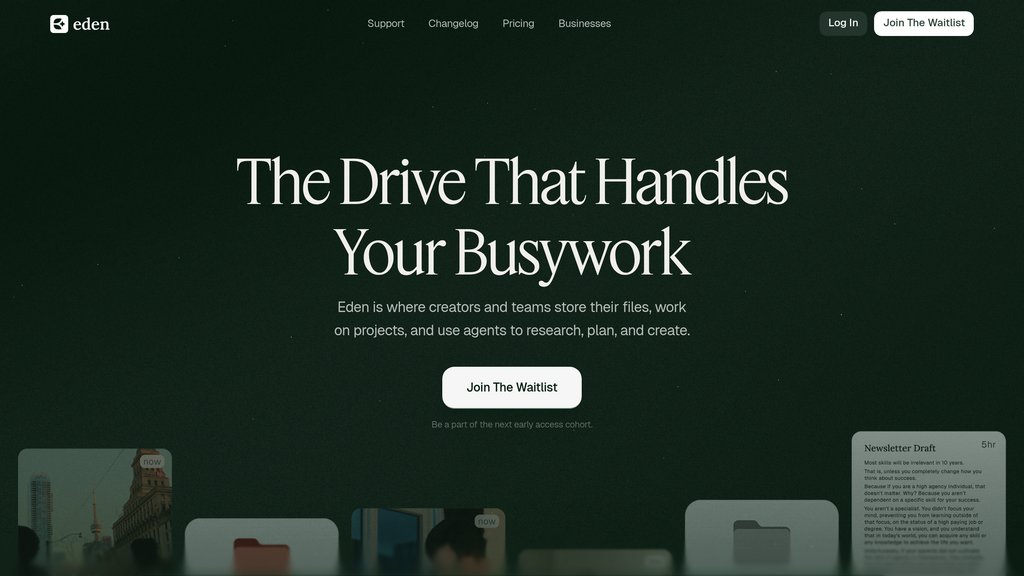 Eden is an intelligent drive and workspace platform designed to eliminate the chaos of managing multiple tools and browser tabs. It serves as a centralized hub where users can store files, links, videos, and research materials that are automatically transcribed, tagged, and made searchable. The platform features advanced visual search capabilities that allow users to find specific video frames or images by describing them in natural language. Eden integrates AI agents that can autonomously handle tasks like research, content creation, document editing, and workspace organization, while providing access to leading AI models including Claude 4.5 Opus through a unified chat interface.