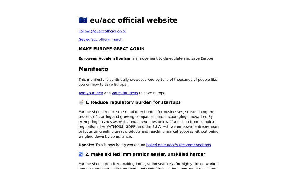 eu/acc is a European initiative launched in 2024 that aims to reduce regulatory burdens on businesses and foster a pro-innovation environment across Europe. It crowdsources ideas to address Europe's economic challenges and promotes practical solutions such as repealing restrictive regulations and creating a unified European startup framework. The movement seeks to empower entrepreneurs and startups by simplifying compliance and enabling them to compete globally.