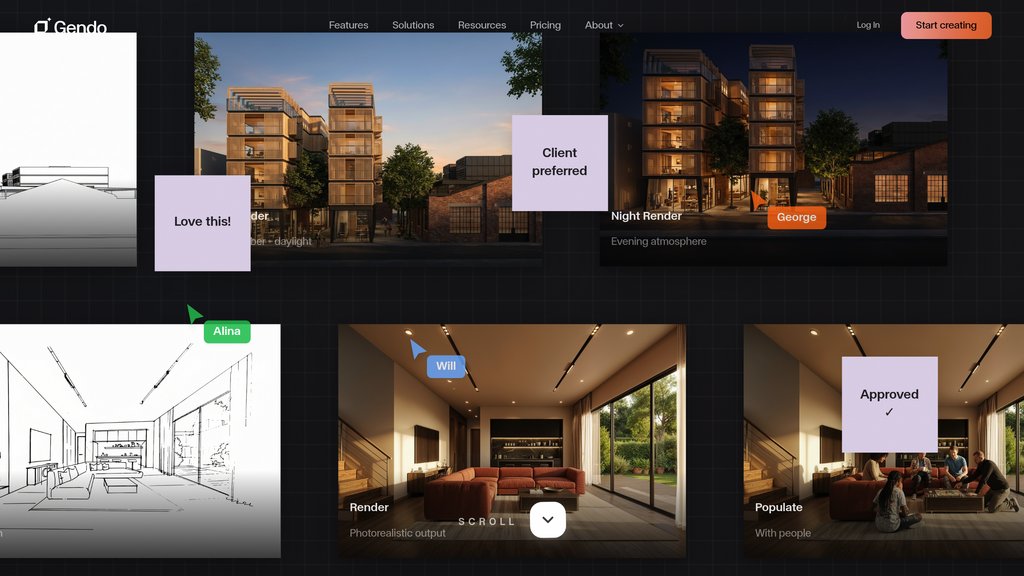 Gendo is a browser-based architectural visualization platform that transforms how design studios produce and iterate on visual content. By uploading 2D sketches or drawings, users can instantly generate photorealistic renders without specialized hardware, expensive software licenses, or deep technical skills. The platform operates as a shared canvas where teams can explore materials, adjust lighting, transfer styles, and refine images collaboratively — compressing what once took days of CGI work into a matter of minutes. Trusted by studios including Zaha Hadid Architects and David Chipperfield Architects, Gendo is purpose-built for professional architectural workflows with strong data privacy and IP protection built in.