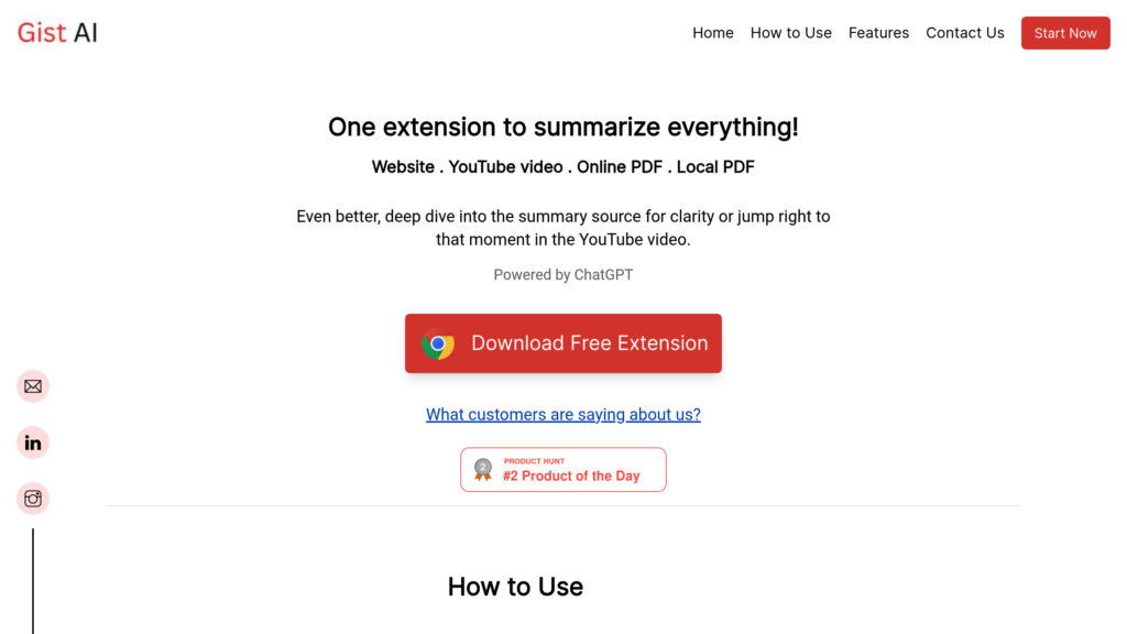 Free Chrome extension powered by ChatGPT that summarizes websites, YouTube videos, and PDFs instantly.