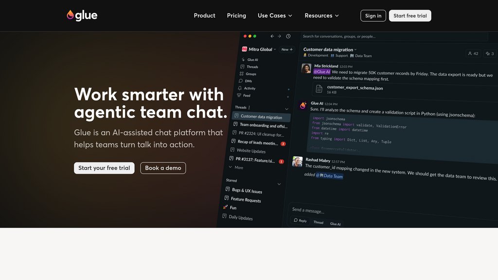 Glue is a modern team chat platform built natively for the AI era that combines the benefits of collaborative messaging with intelligent automation. Unlike traditional team chat platforms that treat AI as an afterthought, Glue places a context-aware agent at the core of team communication. The platform enables teams to file tickets, query internal systems, create calendar events, and execute business actions directly from conversations through its Model Context Protocol (MCP) client integration. Teams can organize work through goal-focused threads, maintain conversation continuity with full historical context, and customize how the AI assistant thinks, speaks, and behaves to match team preferences. Glue supports multiple AI models from top providers with one-click access and offers flexible deployment through webhooks, public APIs, and custom workflow rules.
