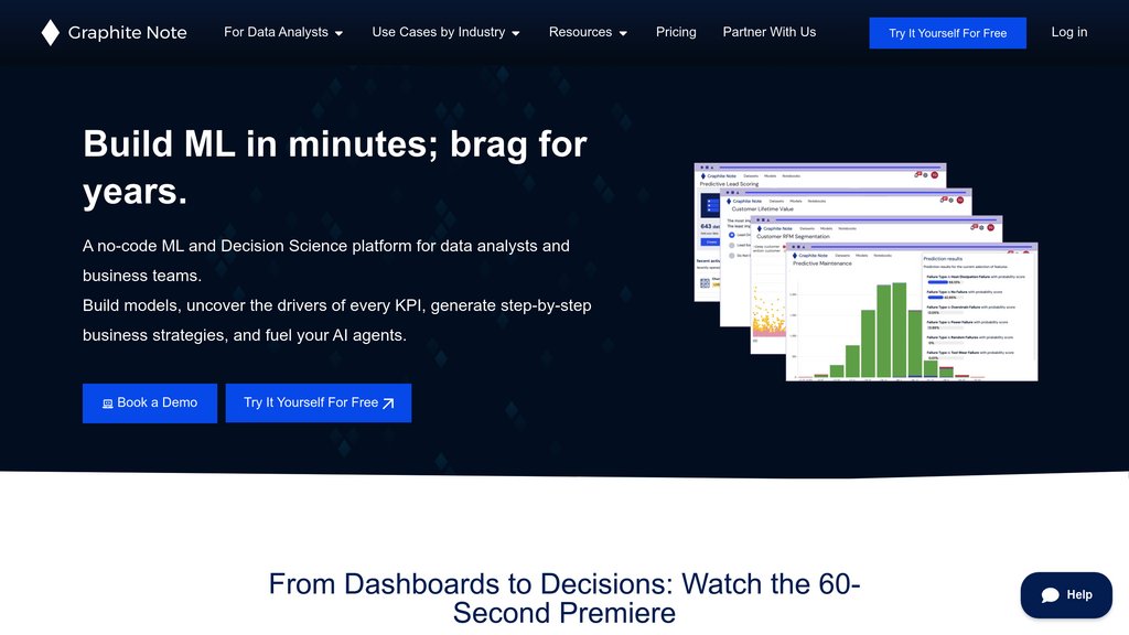 Graphite Note simplifies complex machine learning by providing a no-code environment where users can connect their business data, build predictive models, and uncover key drivers behind outcomes without programming. It supports a wide range of business use cases such as forecasting revenue, predicting customer churn, segmenting customers, and optimizing product demand. The platform also offers prescriptive analytics to recommend next-best actions, helping teams move from insights to optimized decisions efficiently.