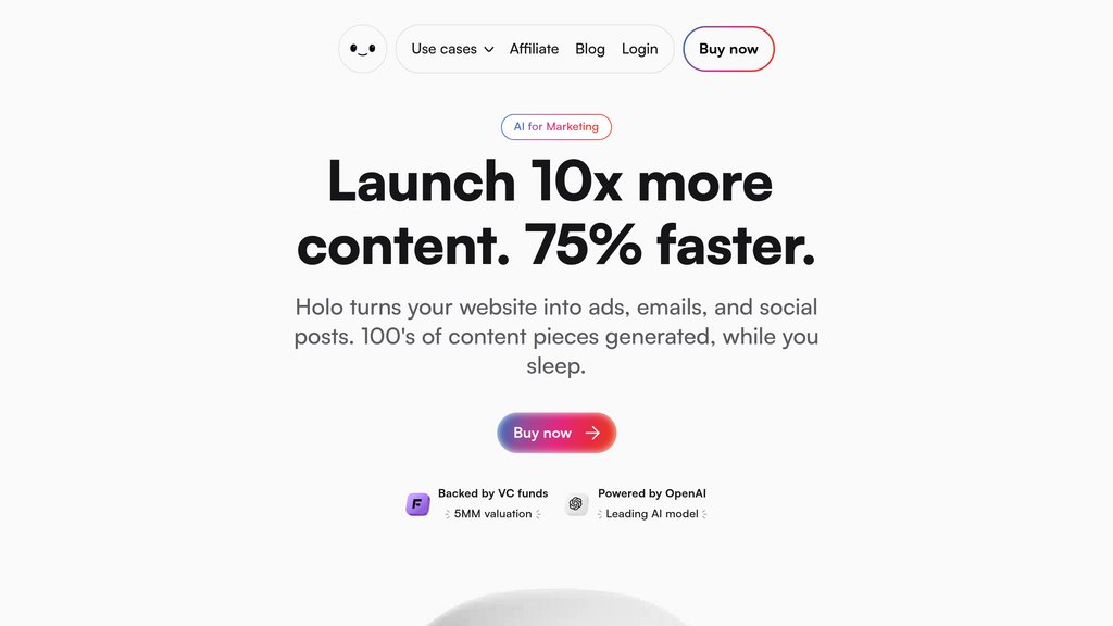 Holo is a comprehensive marketing platform designed for founders and small teams to create professional marketing content at scale without agency costs. By inputting your website URL, Holo learns your brand's unique voice, style, and audience insights to generate hundreds of ready-to-publish marketing assets. The platform creates video ads, static ad creatives, social media posts, email sequences, and promotional campaigns—all fully branded and optimized for performance. Rather than spending weeks on content creation, teams can fill their marketing calendar three months in advance while the platform works in the background. Holo eliminates the need for design expertise or separate tools by consolidating ad creation, email marketing, and social media management into a single, intuitive interface. The platform has been trained on 10+ million marketing assets and 19,000+ high-performing ads from leading ecommerce brands, enabling it to generate content designed for conversion rather than just aesthetics.