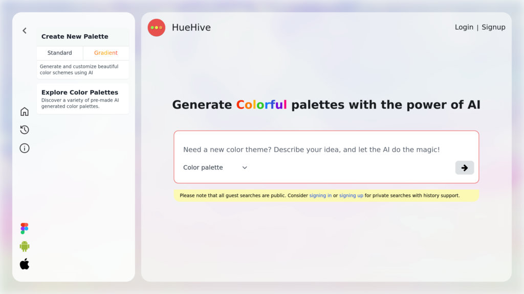 Use HueHive on web, Android, and iOS devices to generate, view, and edit palettes on the go.