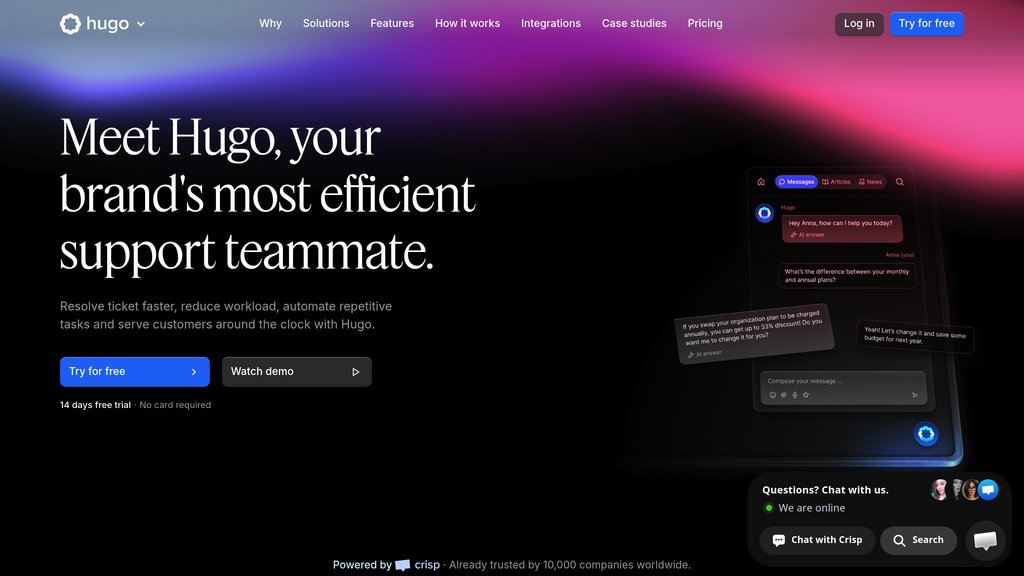 Hugo is a next-generation support agent that helps customer service teams resolve tickets faster, reduce workload, and provide 24/7 assistance. Designed for real-world operations, it can handle complex, multi-turn conversations, pull live context from your business tools, and decide when to act autonomously or involve a human. Hugo runs on European infrastructure with GDPR-compliant safeguards, and offers a no-code interface so teams can deploy, test, and refine their support automation in minutes.