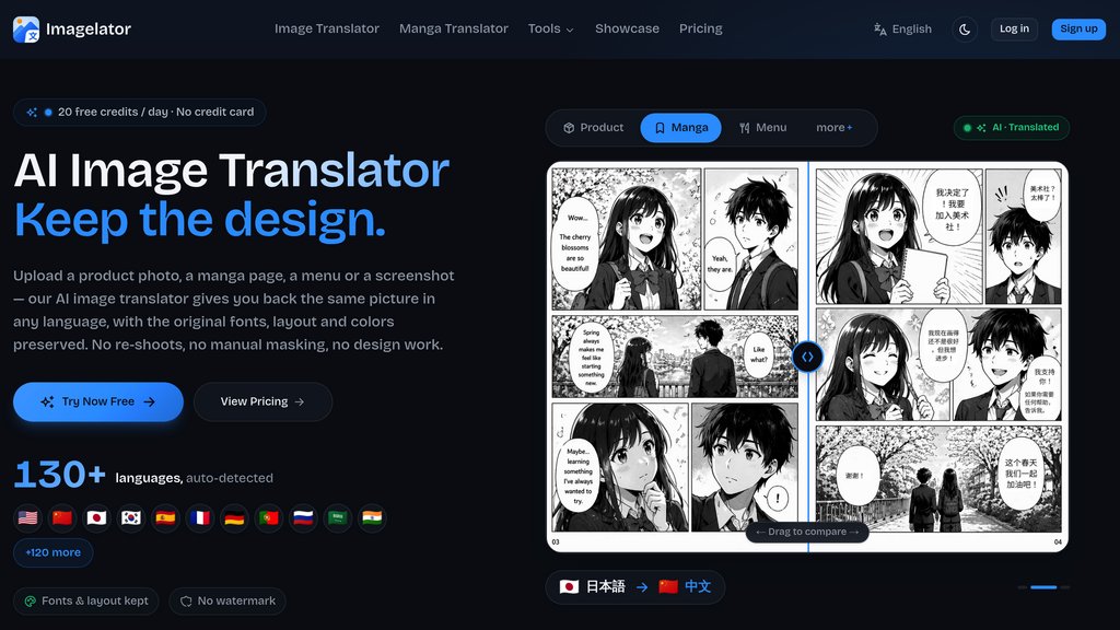 Imagelator is an image translation platform that lets users upload a product photo, manga page, menu, screenshot, or any visual and receive the same image back with all text translated into one of 130+ supported languages. Unlike generic translation tools, Imagelator keeps the original font style, brand colors, text positioning, and layout intact โ so the output looks like a native-language original rather than a patchwork translation. The platform includes a suite of seven tools covering batch translation, manga-specific translation, OCR, text removal, and more, all accessible under a credit-based pricing model with a free daily allowance.