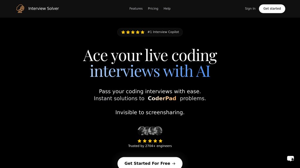 Interview Solver is a desktop-based coding interview assistant designed to deliver instant solutions for technical interview challenges. The application operates as an invisible copilot, providing candidates with real-time answers to coding problems from platforms like LeetCode, HackerRank, and CoderPad without detection by video conferencing systems or interview platforms. Using advanced AI capabilities trained on comprehensive problem sets, Interview Solver transforms the interview experience by eliminating the pressure of solving complex algorithms in real-time while remaining completely undetectable throughout the entire interview process.
