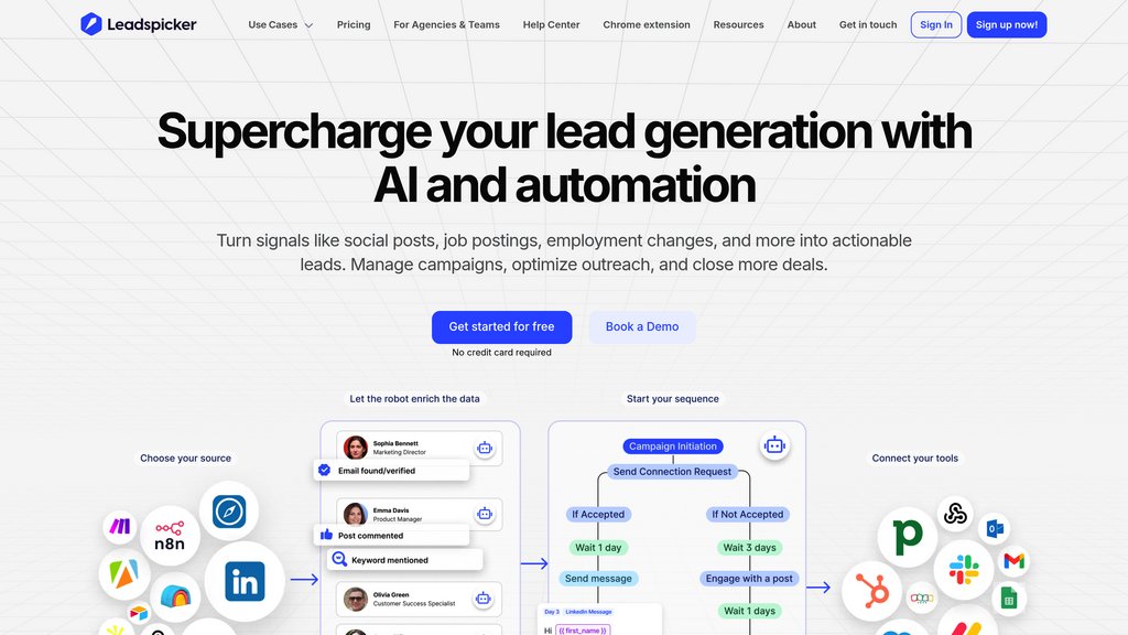 Leadspicker streamlines the entire lead generation and outreach process by automating research, data enrichment, and communication workflows. It continuously monitors signals such as LinkedIn activity and job postings to identify high-intent prospects in real time. The platform supports seamless LinkedIn and email outreach with AI-crafted personalized messages and automated follow-ups, ensuring high engagement and response rates. Integrated domain health checks and email warm-up features optimize deliverability, while real-time analytics enable ongoing campaign optimization. Designed for sales teams, recruiters, marketers, and small businesses, Leadspicker accelerates pipeline growth and helps users focus on closing deals by handling repetitive tasks efficiently.