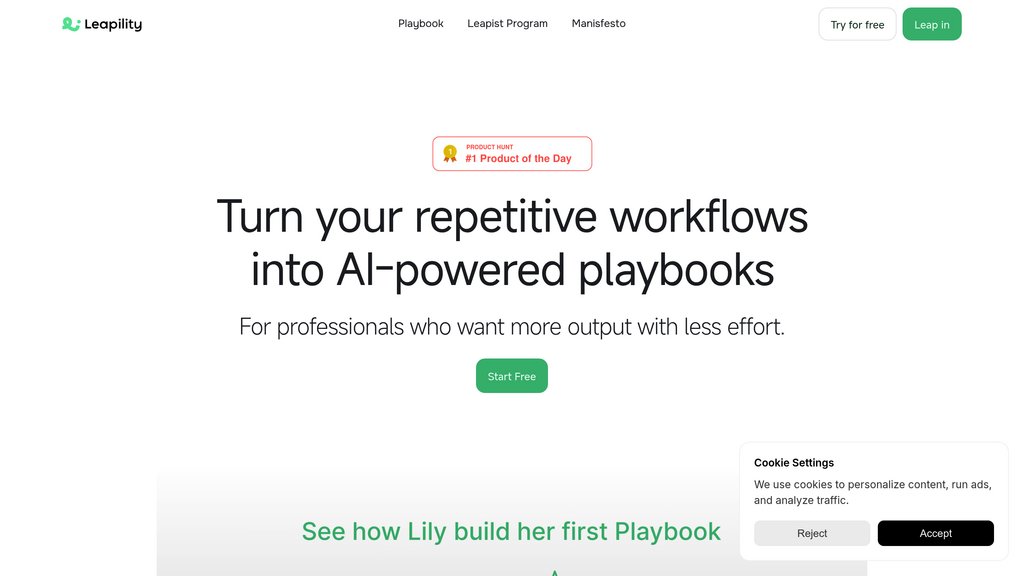 Leapility is a workflow automation platform that lets experts, freelancers, and teams describe their processes in plain language, then run them as reusable playbooks. Users can map goals, steps, sources, and rules once, iterate in a guided workspace, and save the result as a playbook that executes the entire task on demand. These playbooks can be combined with custom knowledge and personas to create Expert Agents that work alongside you and can be shared or monetized through a marketplace, helping scale output without adding more hours.