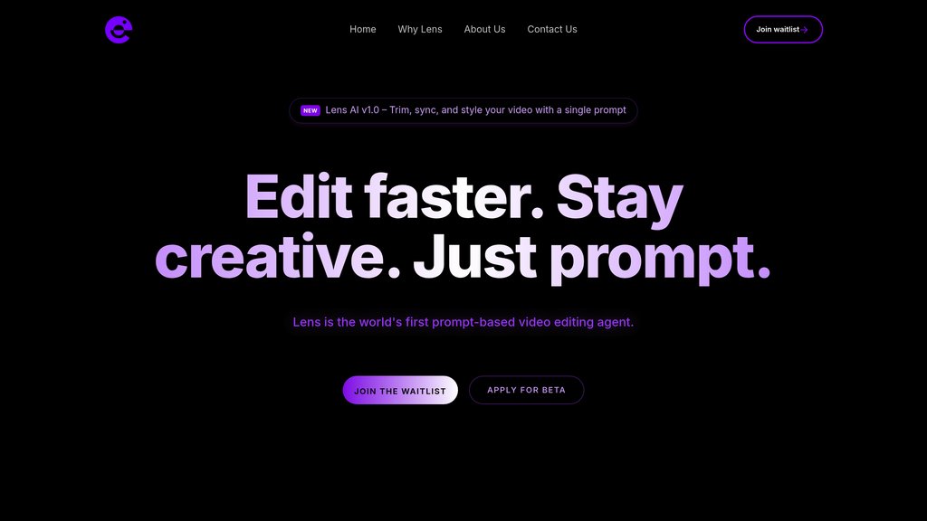 Lens is a revolutionary video editing platform that eliminates the complexity of traditional editing workflows by allowing creators to edit videos using simple text prompts. Instead of navigating complex timelines and manual tools, users can type natural language commands like 'cut intro, add zoom, sync captions' and watch Lens execute these edits automatically. The platform is designed to give creators back their time by handling tedious editing tasks while maintaining professional-quality output. Built with a focus on speed and intuitive interaction, Lens represents a paradigm shift from manual editing to prompt-driven video creation.