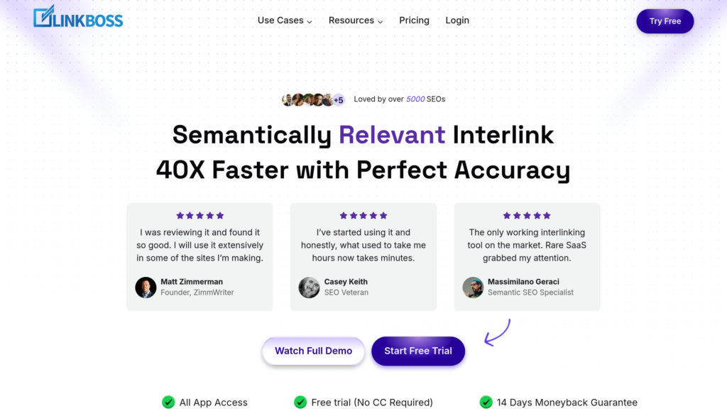 LinkBoss is an advanced AI-driven internal linking solution designed to enhance SEO by creating semantically relevant links within websites. Leveraging natural language processing, machine learning, and big data, it analyzes content context to suggest and generate natural anchor texts and links. The platform supports bulk interlinking, silo and topic cluster creation, and offers a unified dashboard to manage multiple sites efficiently. LinkBoss integrates with popular WordPress editors and page builders, providing detailed link reports and site visualizations to optimize site architecture and user experience.