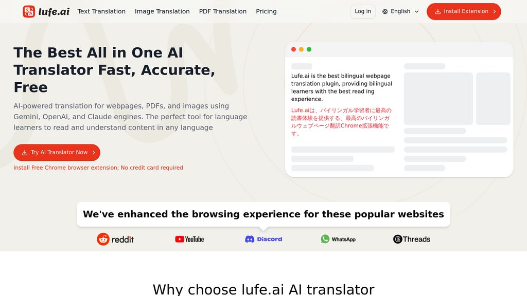 Lufe AI is an innovative translation platform designed to break language barriers through intelligent image and text translation. Unlike traditional translation tools that require manual text input, Lufe AI uses advanced optical character recognition (OCR) combined with neural machine translation technology to instantly extract and translate text from images, screenshots, PDFs, and webpages. The platform combines multiple AI engines including Gemini, OpenAI, and Claude to deliver contextually accurate translations that preserve tone and meaning. With support for over 100 languages and automatic language detection, Lufe AI transforms how users interact with multilingual content, whether through bilingual webpage reading, document translation, or video subtitle generation.