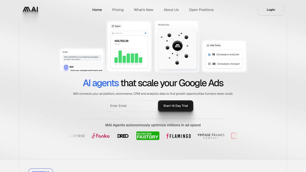 MAI is a performance marketing platform that combines autonomous AI agents with comprehensive data integration to transform how businesses manage digital advertising. The platform connects to Google Ads, ecommerce platforms, CRM systems, and analytics tools to create a unified view of marketing performance. MAI's AI agents autonomously manage campaigns 24/7, optimizing bids, budgets, and creative assets in real-time while integrating inventory and customer data to prevent budget waste from stockouts or broken promotions. Built by engineers with deep experience at Google and Instacart, the platform is designed to handle complex performance marketing at scale, managing millions of dollars in ad spend monthly while delivering transparent ROAS guarantees and measurable revenue lift.