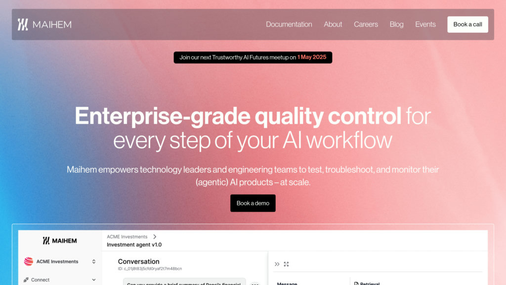 MAIHEM.ai is a comprehensive AI quality assurance platform designed for technology leaders and engineering teams to test, troubleshoot, and monitor AI applications, especially large language model (LLM) workflows. It uses advanced AI agents to simulate thousands of user interactions and edge cases, enabling continuous and automated testing from development through deployment. The platform emphasizes security, compliance, and performance, helping organizations catch critical flaws, ensure regulatory adherence, and improve AI reliability and safety with military-grade IT security standards.
