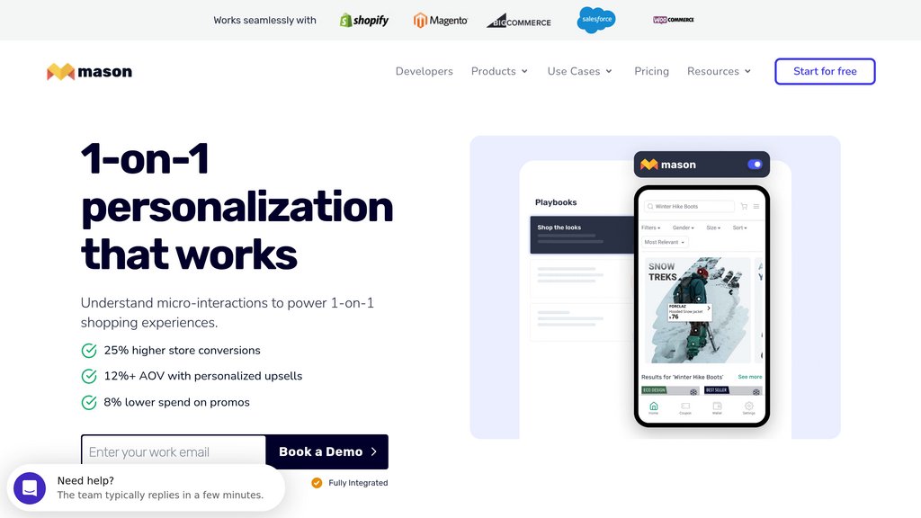Mason is a comprehensive commerce engine designed to help brands and retailers optimize every aspect of the online shopping experience. By combining advanced merchandising, promotion, and personalization capabilities, Mason enables businesses to connect directly with customers, streamline product discovery, and maximize conversions. Its flexible, no-code platform offers over 50 specialized apps for store optimization, while its data-driven automation tailors offers and recommendations in real time. Mason’s infrastructure supports brands in reducing reliance on major marketplaces, improving average order value, and increasing customer engagement across multiple channels.