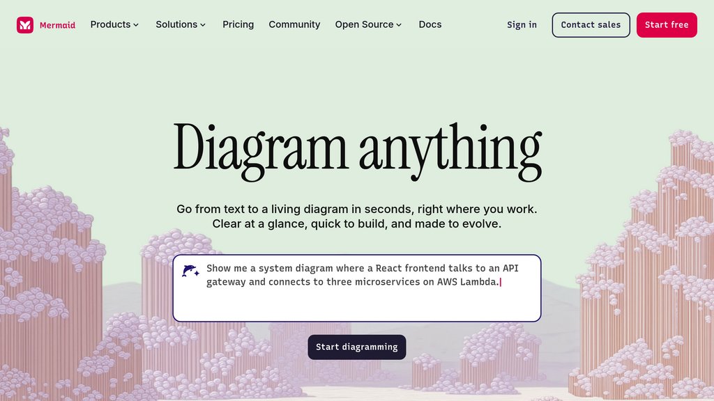 Text-to-diagram platform that turns plain language or Markdown-style code into clean, shareable visuals in seconds, built by the creators of the open-source Mermaid.js.