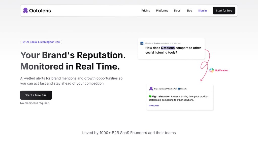 Octolens is a social listening tool designed for B2B SaaS companies to monitor web and social media mentions, prioritize relevant conversations, and enable timely engagement.