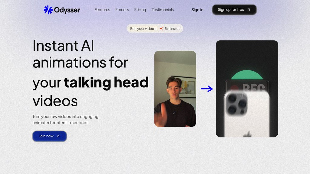 Odysser is a video animation platform designed to replace the manual grind of traditional video editing. It analyzes your video's script, lighting, and framing to automatically generate a storyboard, animate each element, and integrate the final animations into your video — all without requiring timeline-based editing skills. It's built for creators, editors, agencies, and marketing teams who want to produce high-quality, on-brand video content faster and at scale.